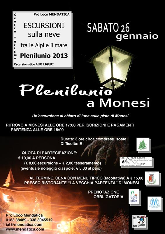 Sabato 26 gennaio il Centro di Turismo Escursionistico della Pro Loco di Mendatica saluterà la prima luna piena dell’anno con un evento ormai divenuto tradizionale per i frequentatori della stazione sciistica di Monesi: una ciaspolata notturna sulle piste, appuntamento ormai consolidato da diversi anni che nelle migliori edizioni ha vantato la presenza di oltre 100 partecipanti.