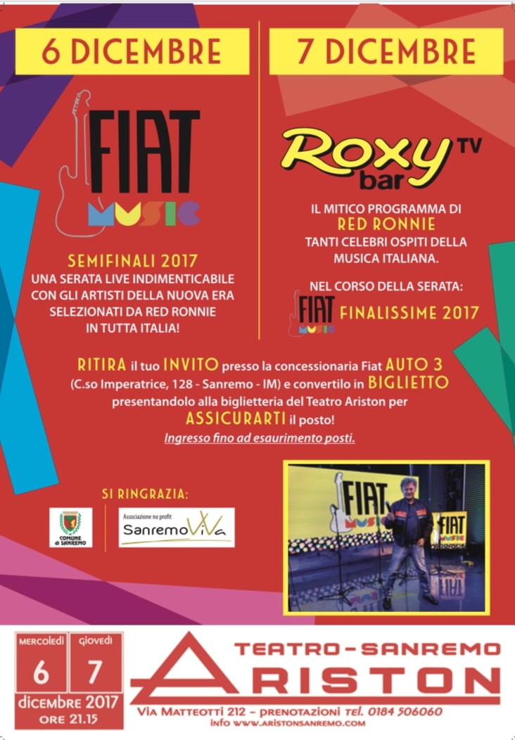 Gli inviti gratuiti per le serate a Teatro Ariston sono disponibili  alla concessionaria Auto3 (corso Imperatrice 128, Sanremo). l’invito potrà essere convertito in biglietto presentandolo alla biglietteria del Teatro Ariston. Ingresso fino a esaurimento posti.