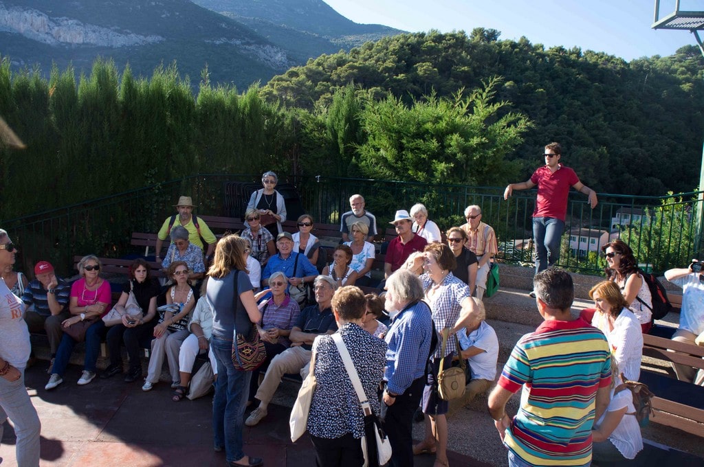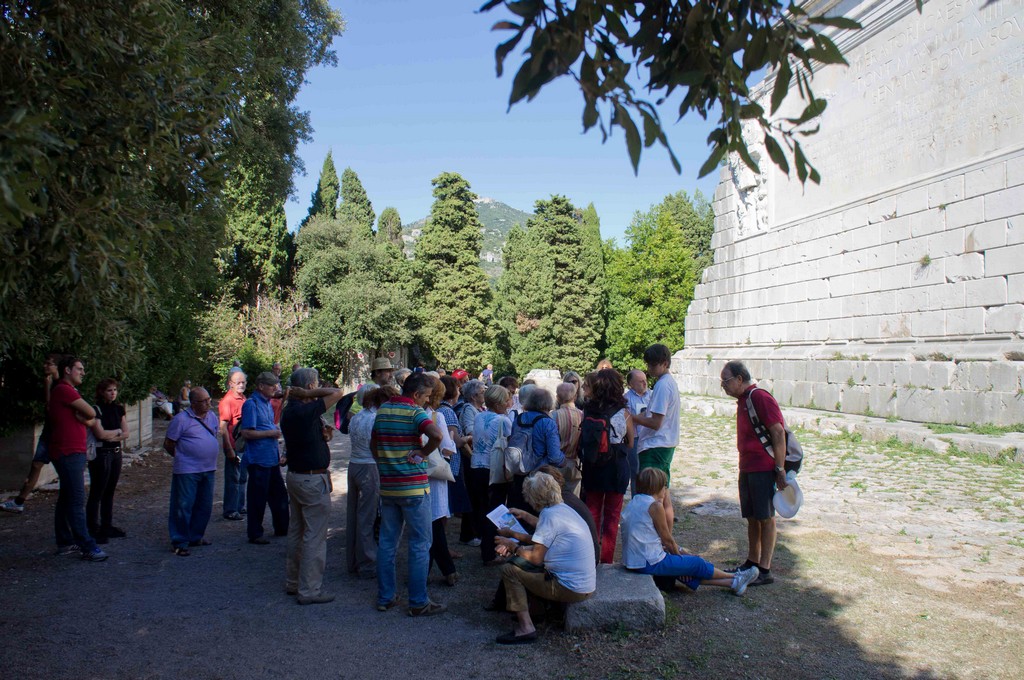 Riemersi alla luce del sole ci si è trasferiti al villaggio di La Turbie dove, dopo la pausa pranzo si è svolta la visita al sito archeologico del Trofeo di Augusto. All’ombra del grandioso monumento imperiale romano la dottoressa Daniela Gandolfi del Museo Civico di Ventimiglia e il dottor Luigi Gambaro della Soprintendenza Archeologica della Liguria hanno descritto l’imponente trofeo e hanno inquadrato l’epoca in cui è stato edificato e i motivi per cui è stato realizzato; il sig. Salvatore Bafurno ha concluso enumerando e localizzando le popolazioni dell’arco alpine citate sulla grande iscrizione presente sul monumento.