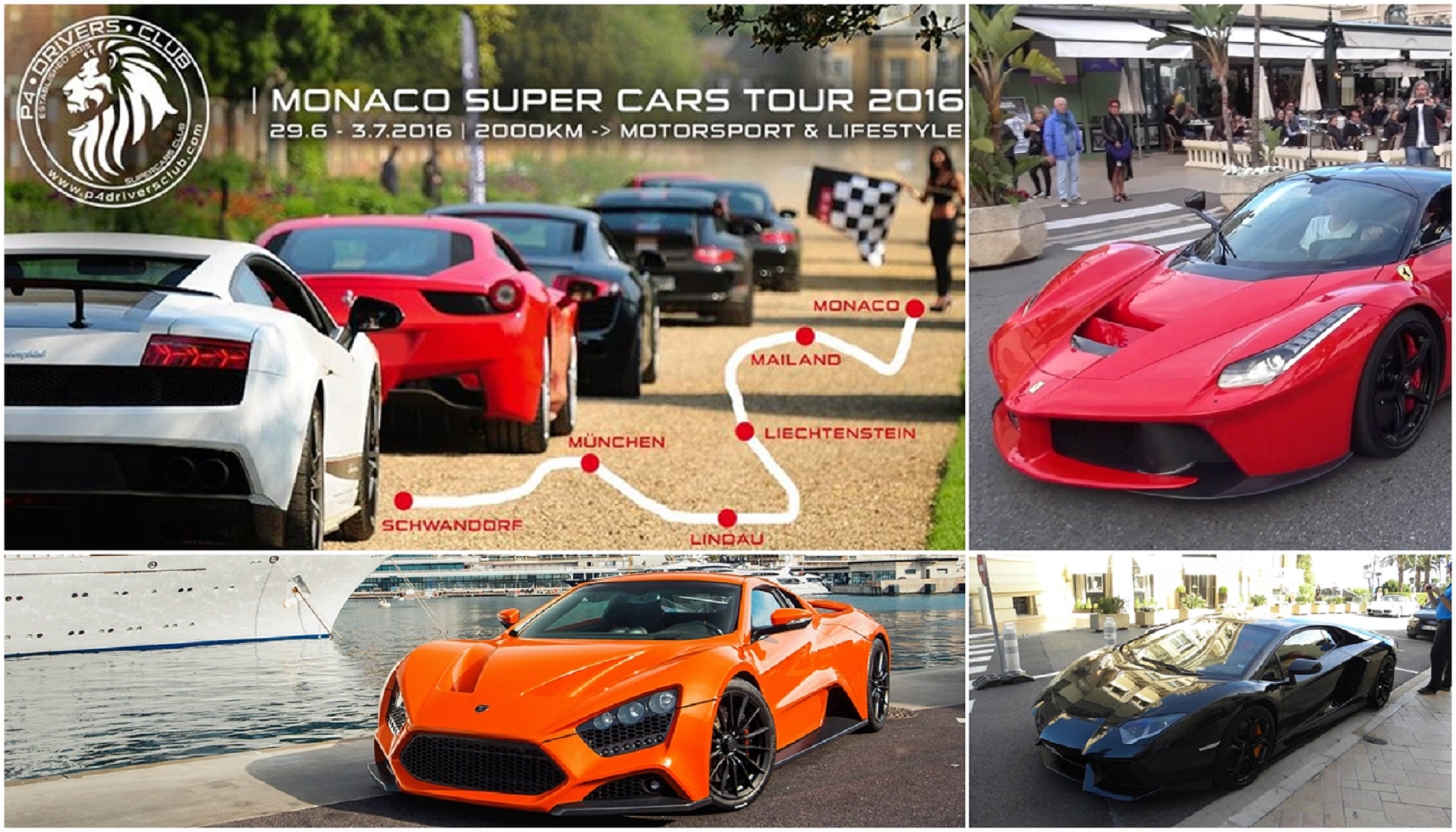 Arriveranno a Montecarlo il 3 luglio dopo 5 tappe e 2mila chilometri i motori rombanti delle spettacolari macchine del "Monaco Super Cars Tour 2016". Organizzato dal club esclusivo tedesco "P4 Drivers Club", il Super Cars Tour partirà da Schwandorf il 26 giugno alle 9 del mattino per poi passare nel capoluogo della Baviera, Monaco. La terza tappa sarà Lindau la splendida cittadina sul lago di Costanza per una breve pausa prima di ripartire per il principato di Liechtenstein. Poi si passerà in Italia facendo tappa a Milano. Dalla capitale della moda italiana il gruppo di super automobili sportive raggiungerà il principato di Monaco passando per le più belle strade costiere della Liguria e Costa Azzurra. A Montecarlo i "piloti" e i loro accompagnatori passeranno alcuni giorni di relax tra "passeggiate" a bordo dei loro bolidi e feste nei club più esclusivi.