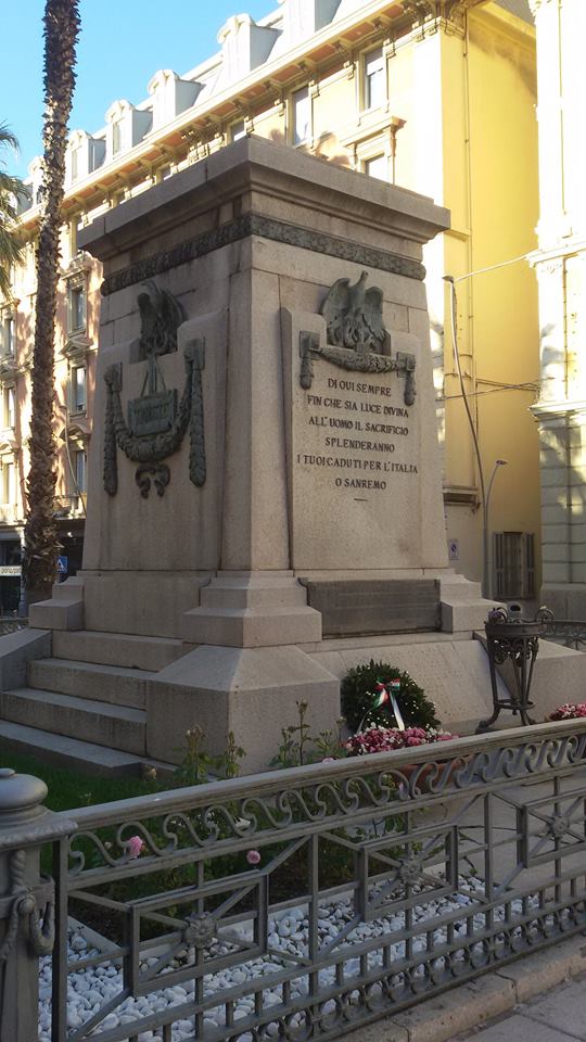 Dalla Belle Époque deriva, inoltre, il Monumento ai Caduti di Sanremo, creato da Vincenzo Pasquali nel 1923 e posizionato in corso Mombello all’incrocio con via Roma. Il gruppo scultoreo bronzeo venne fuso a scopi bellici durante la seconda guerra mondiale, comunque il basamento risulta interessante da osservare. Vi spiccano i simboli della vittoria ed è riportato il “Bollettino della Vittoria” dell’Italia nella Grande Guerra, firmato dal generale Armando Diaz e datato 4 novembre 1918, quando si conquistarono Trento e Trieste. Ogni anno il 4 novembre si celebra la ricorrenza con la Giornata dell’Unità Nazionale e delle Forze Armate.