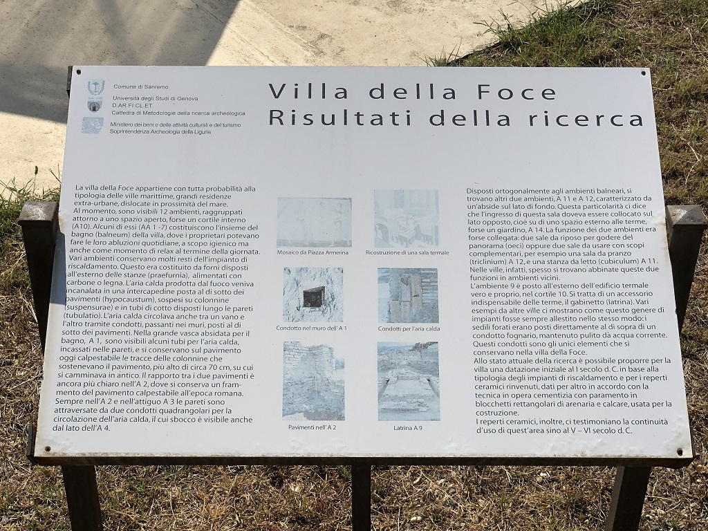 A poche decine di metri dal mare, la Villa Romana di Sanremo, nota anche come Villa Matutiae, è situata nel quartiere Foce, a ponente di Sanremo, tra le spiagge e la pista ciclabile realizzata sull’ex tracciato ferroviario, che corre lungo le mura che cingono il Cimitero Monumentale. Di epoca romana, fu costruita tra il I e il III secolo d.C. e utilizzata fino al V o VI secolo d.C.