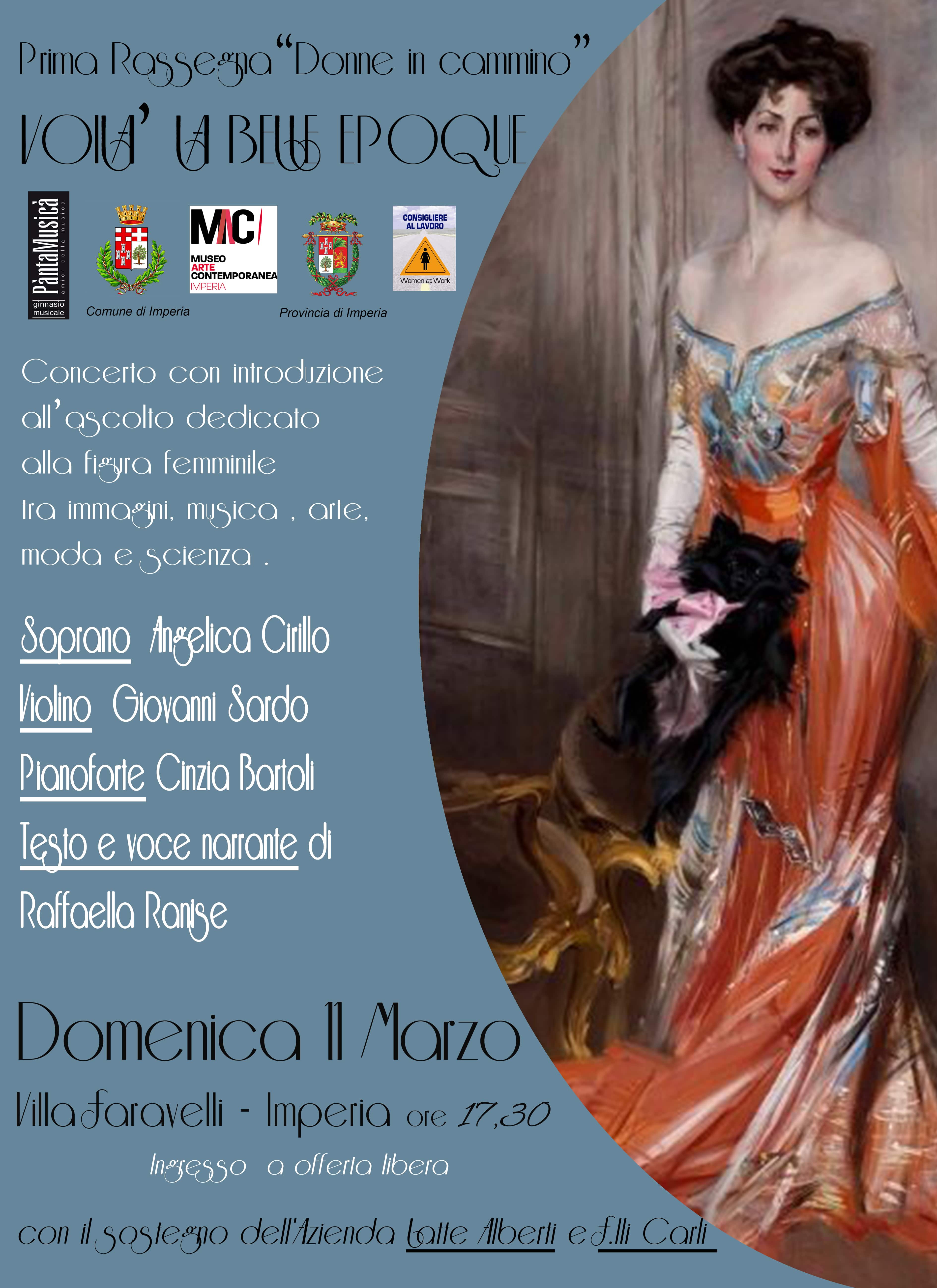 L’appuntamento è per Domenica 11 Marzo con Voilà la Belle Epoque: concerto con introduzione all’ascolto dedicato alla figura femminile. Tra immagini, musica, arte, moda e scienza. L’evento vedrà la soprano Angela Cirillo accompagnata dal violino di Giovanni Sardo e dal piano di Cinzia Bartoli, con il testo e la voce narrante a cura di Raffaella Ranise: quattro artisti internazionali a rappresentare le eccellenze liguri. Dalla Regina Margherita a Mata Hari, da La Bella Otero a Maria Montessori, da Marie Curie a Eleonora Duse: la narrazione seguirà le storie di queste ed altre donne che hanno contribuito ad emancipare la figura femminile nella storia.