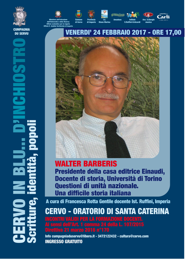 Gli appuntamenti letterari di “Cervo in blu…d’inchiostro” proseguono venerdì 24 febbraio con Walter Barberis, tra i più autorevoli storici contemporanei nonché presidente della prestigiosa casa editrice Einaudi. Barberis sarà protagonista del quinto incontro in calendario sul tema “Questioni di unità nazionale. Una difficile storia italiana”, che approfondirà il tema dell’Italia divisa tra ieri e oggi e nell’ambito del quale sarà presentato anche l’ultimo libro dell’autore, “Bisogno di patria”.